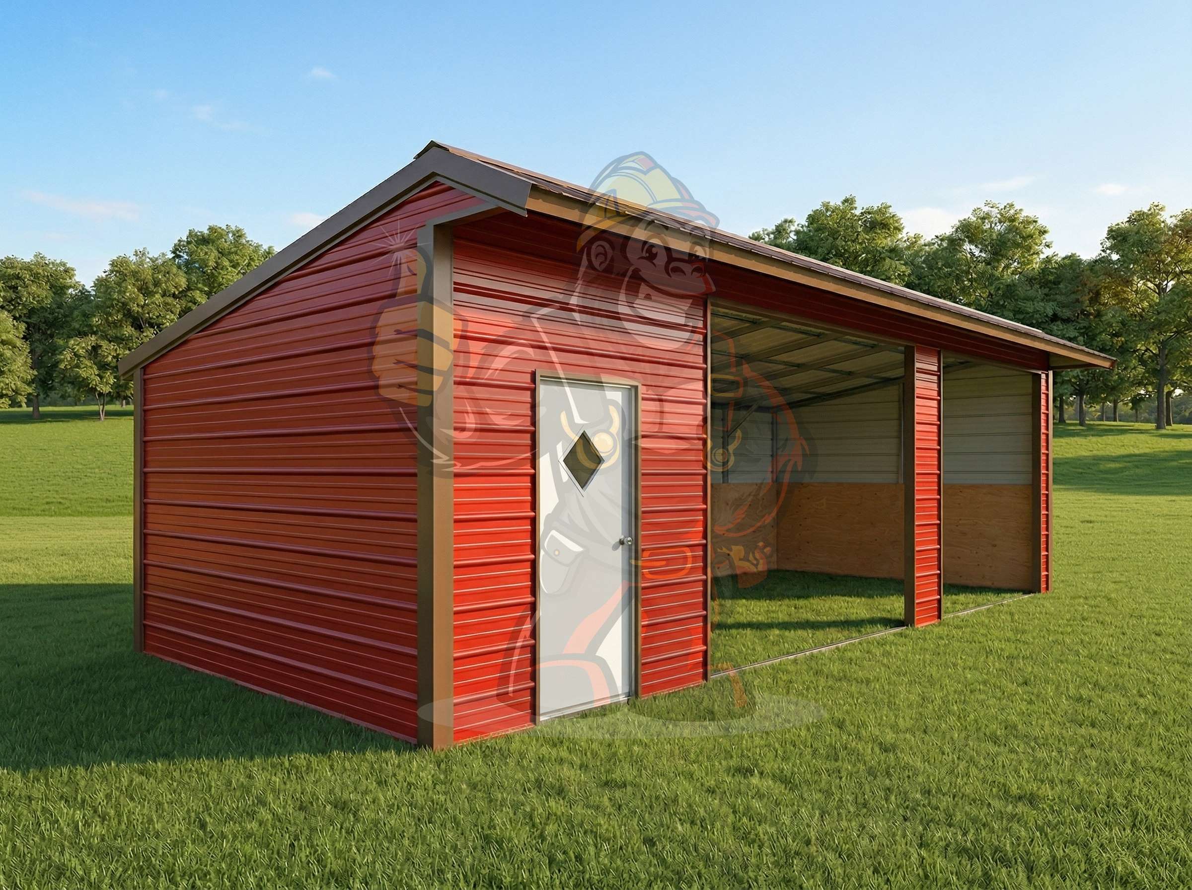 Upgrade your property with The Bull 24′ x 35′ x 14′ Steel Workshop, a bold and rugged choice for multi-vehicle storage, workshop projects, and heavy-duty equipment with its spacious gable-roof design. Featuring vibrant red 29-gauge sheet metal, a convenient walk-in door, and wide open bays, this building stands strong for everyday reliability and serious work.