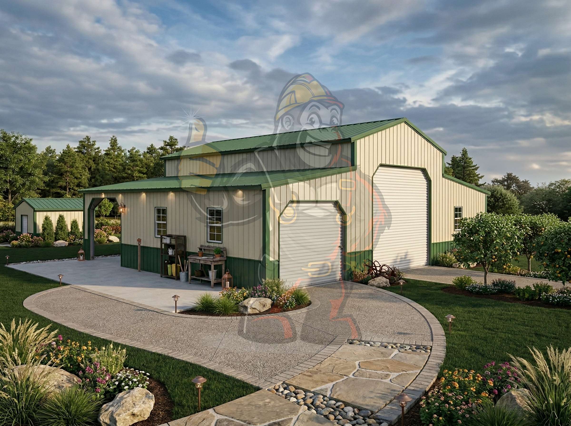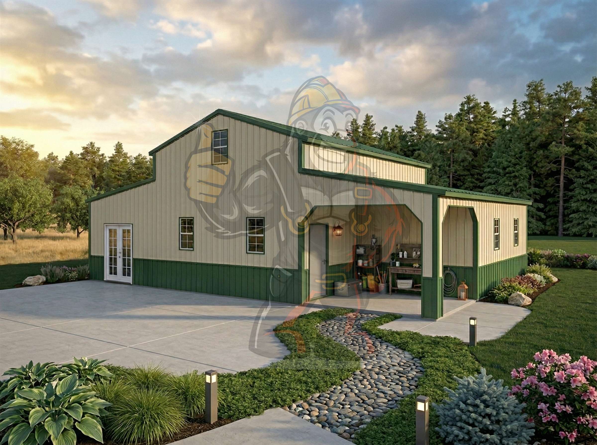 Covered Lean-To Open Bay: Provides sheltered space for vehicles, equipment, or outdoor work right beside the main structure.