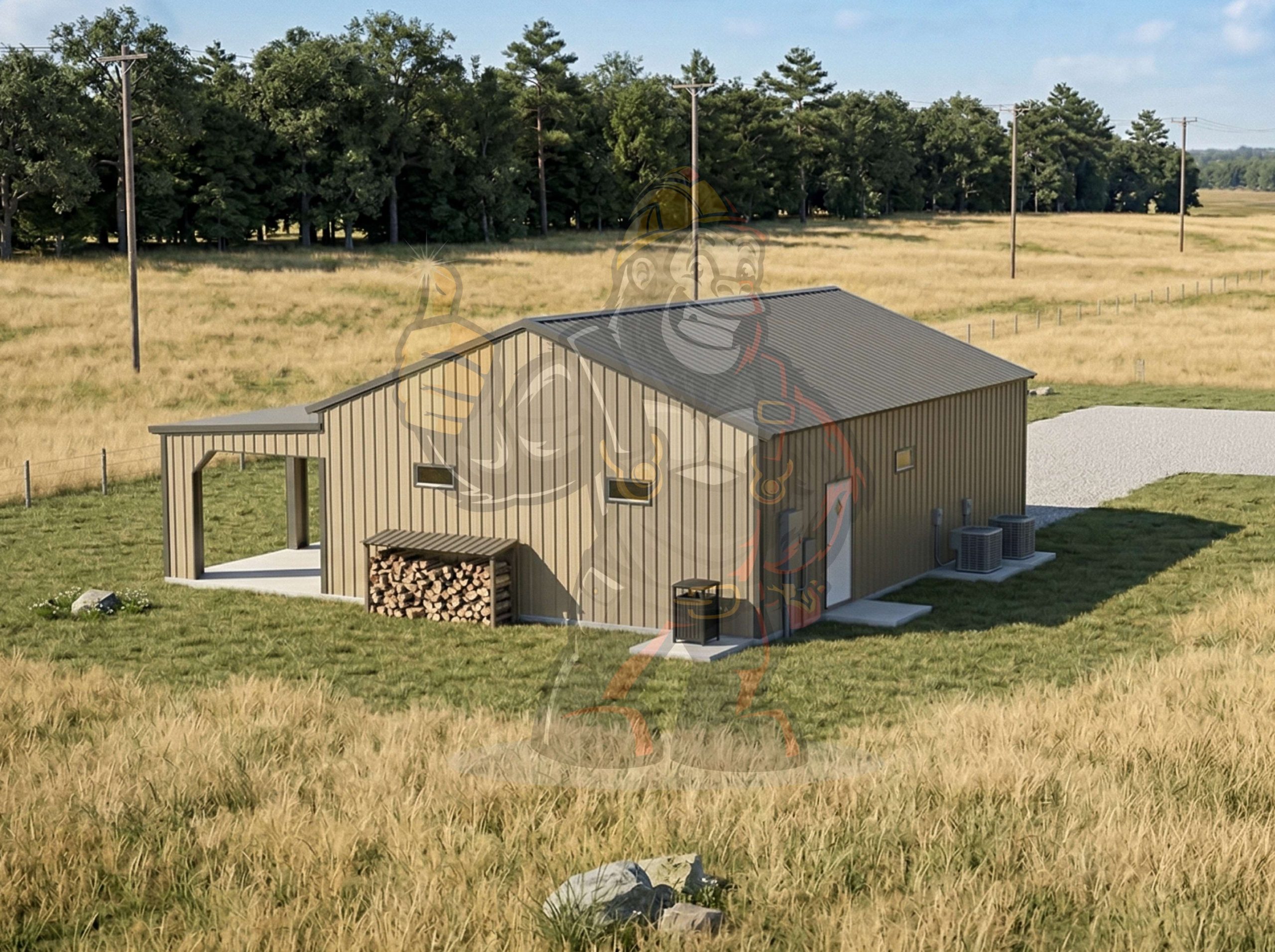 Covered Lean-To: Attached open lean-to delivers protected outdoor workspace or additional sheltered storage.
